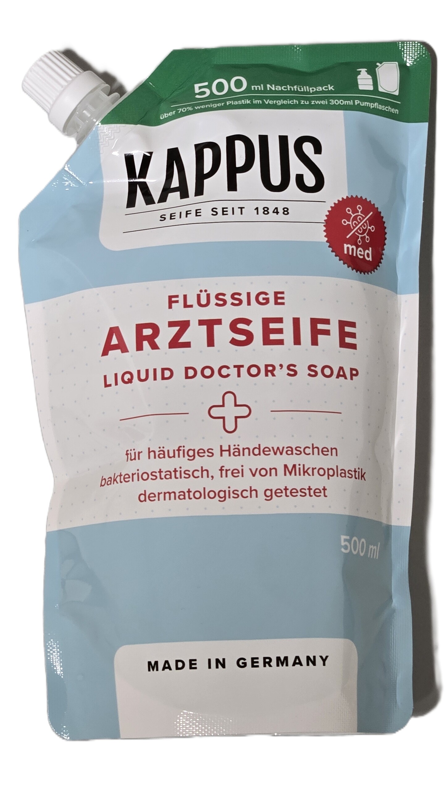 Die flüssige Arztseife von KAPPUS eignet sich hervorragend für häufiges Händewaschen. Durch die neu entwickelte Formulierung mit den Wirkstoffen Lamesoft PO 65 sowie Provitamin B (Dexpanthenol) wird die Haut spürbar weich und geschmeidig. Die flüssige Arztseife von KAPPUS ist mikroplastikfrei und enthält weder Mineralöle noch Silikone. Die Hautverträglichkeit ist dermatologisch bestätigt. Der Nachfüllpack spart > 70% Plastikmüll im Vergleich zu zwei 300ml Spendern und ist damit besonders umweltschonend.